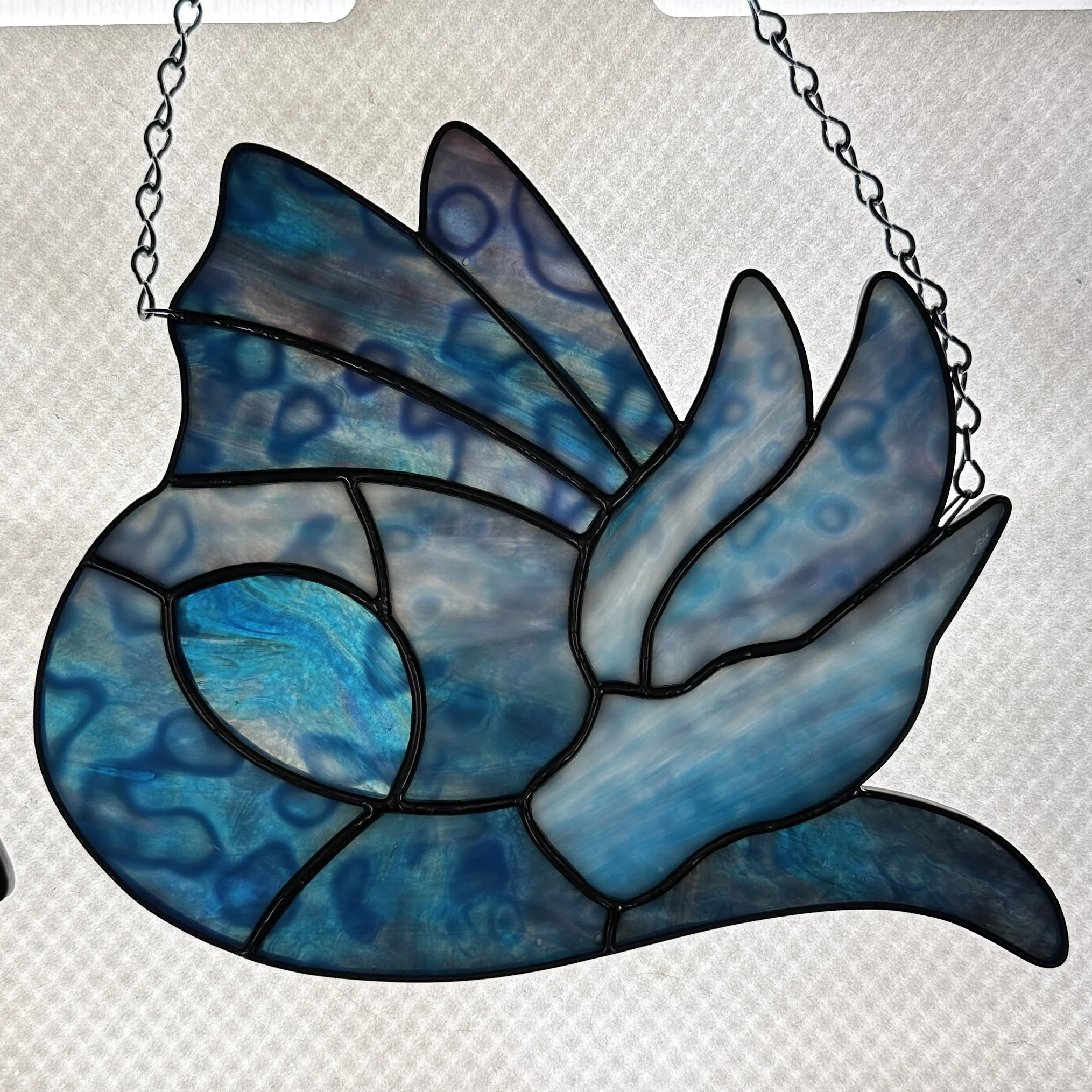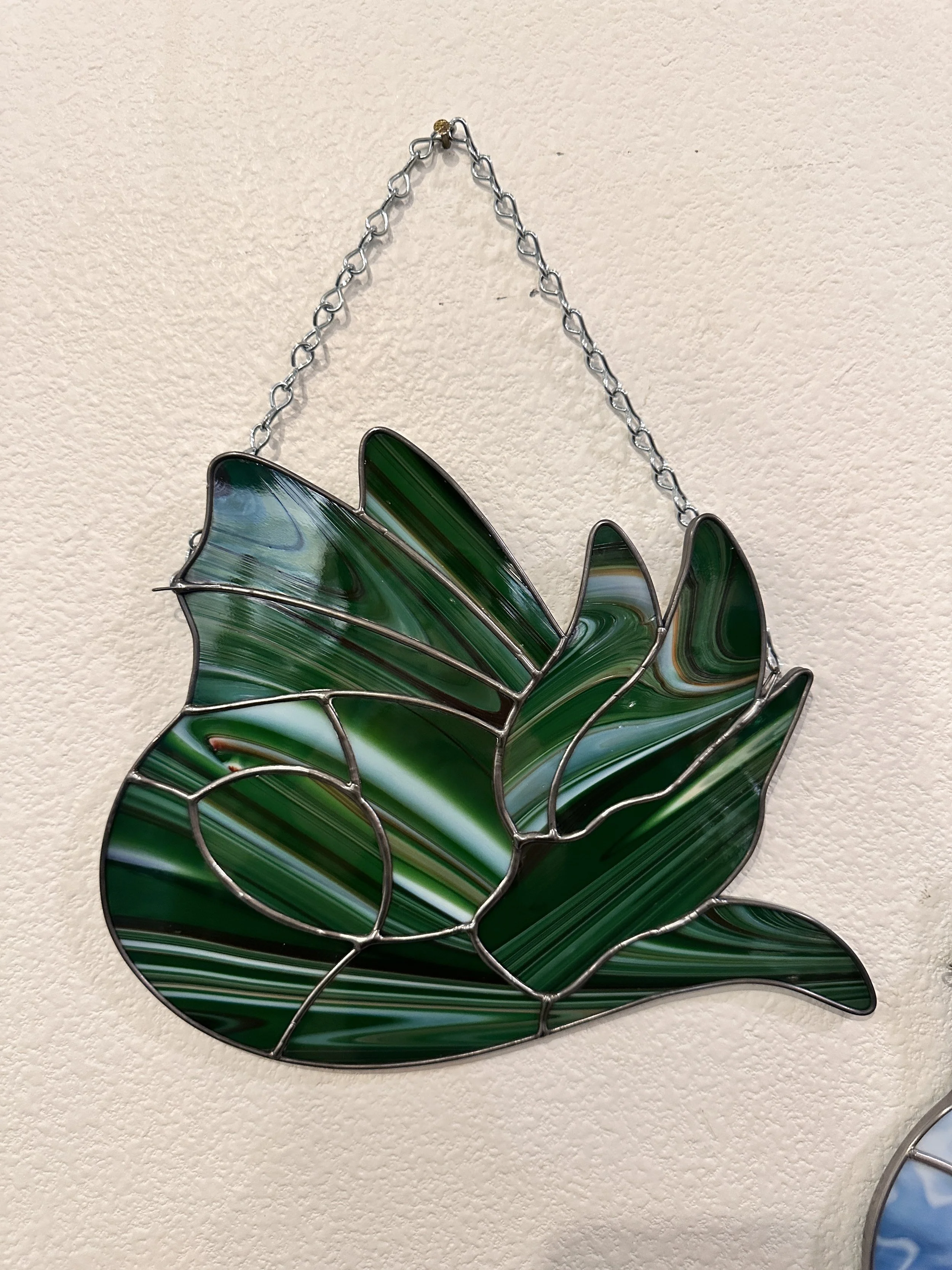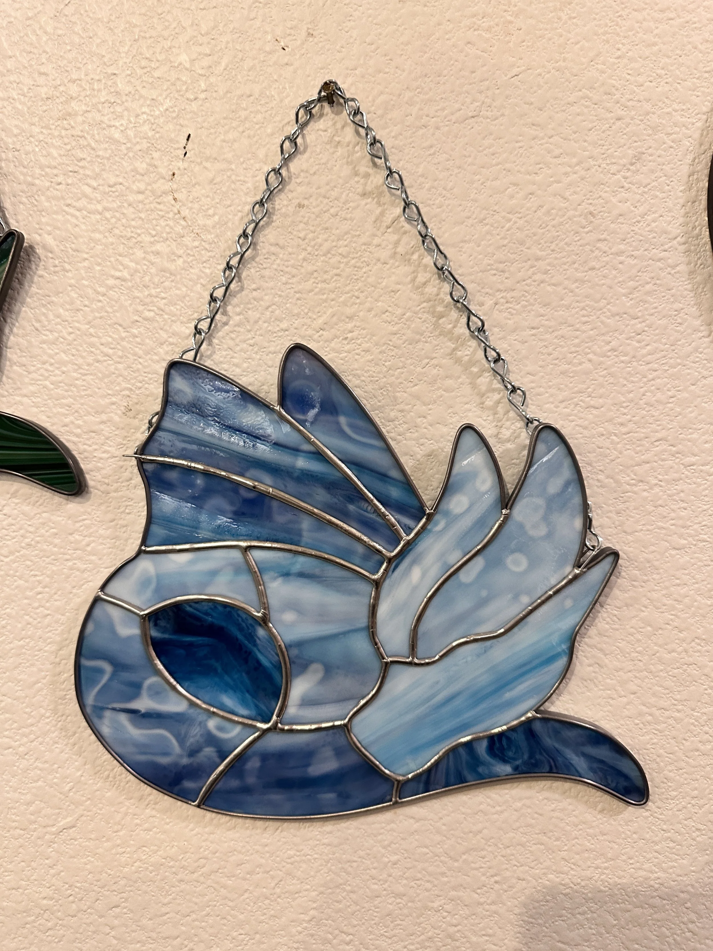 This stained glass sun catcher features a black cat perched on a crescent moon with a serene, detailed face, bringing a touch of whimsical charm and colorful light to any window. Crafted with vibrant, hand-cut glass, it creates a captivating display as sunlight passes through.