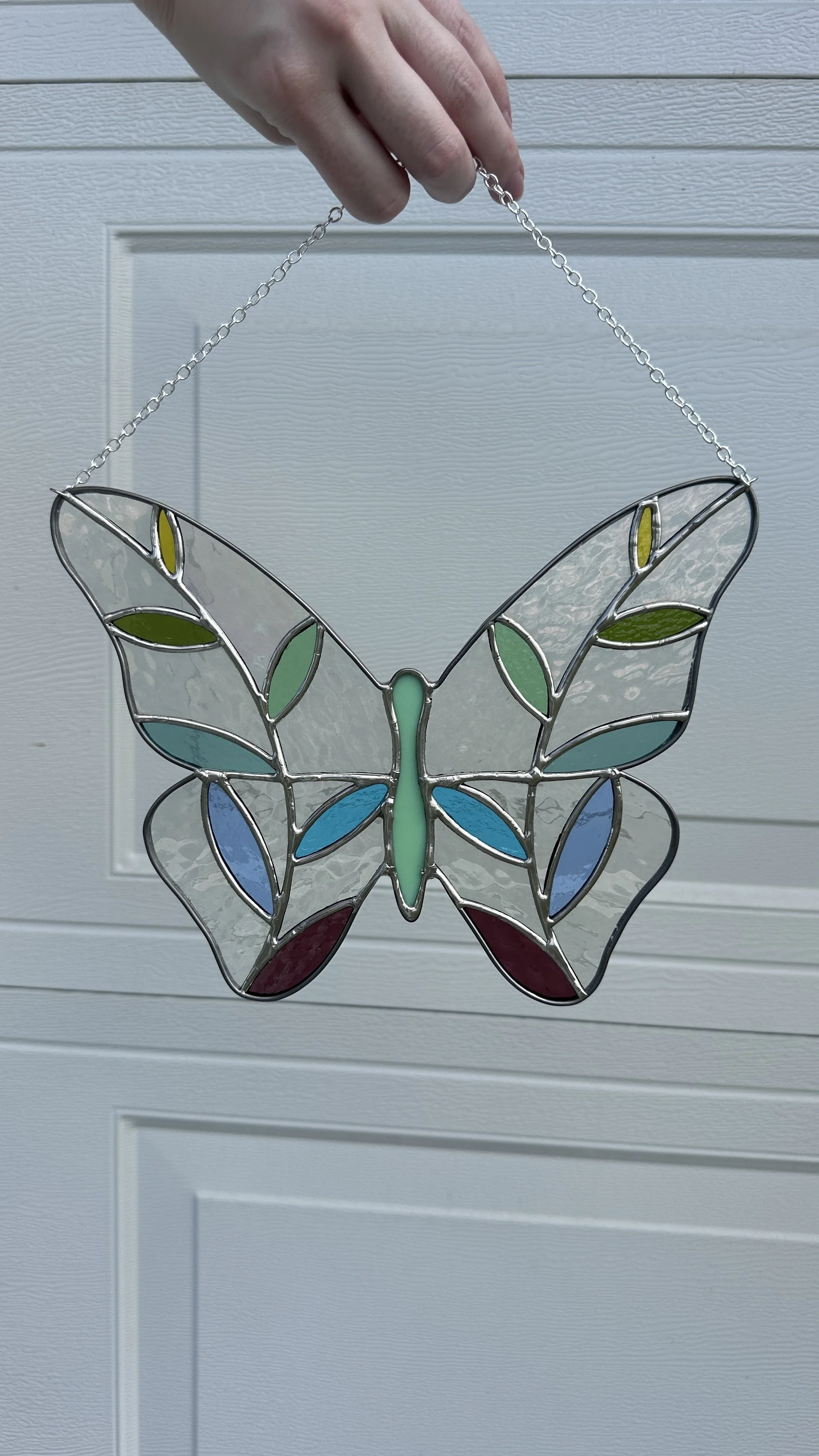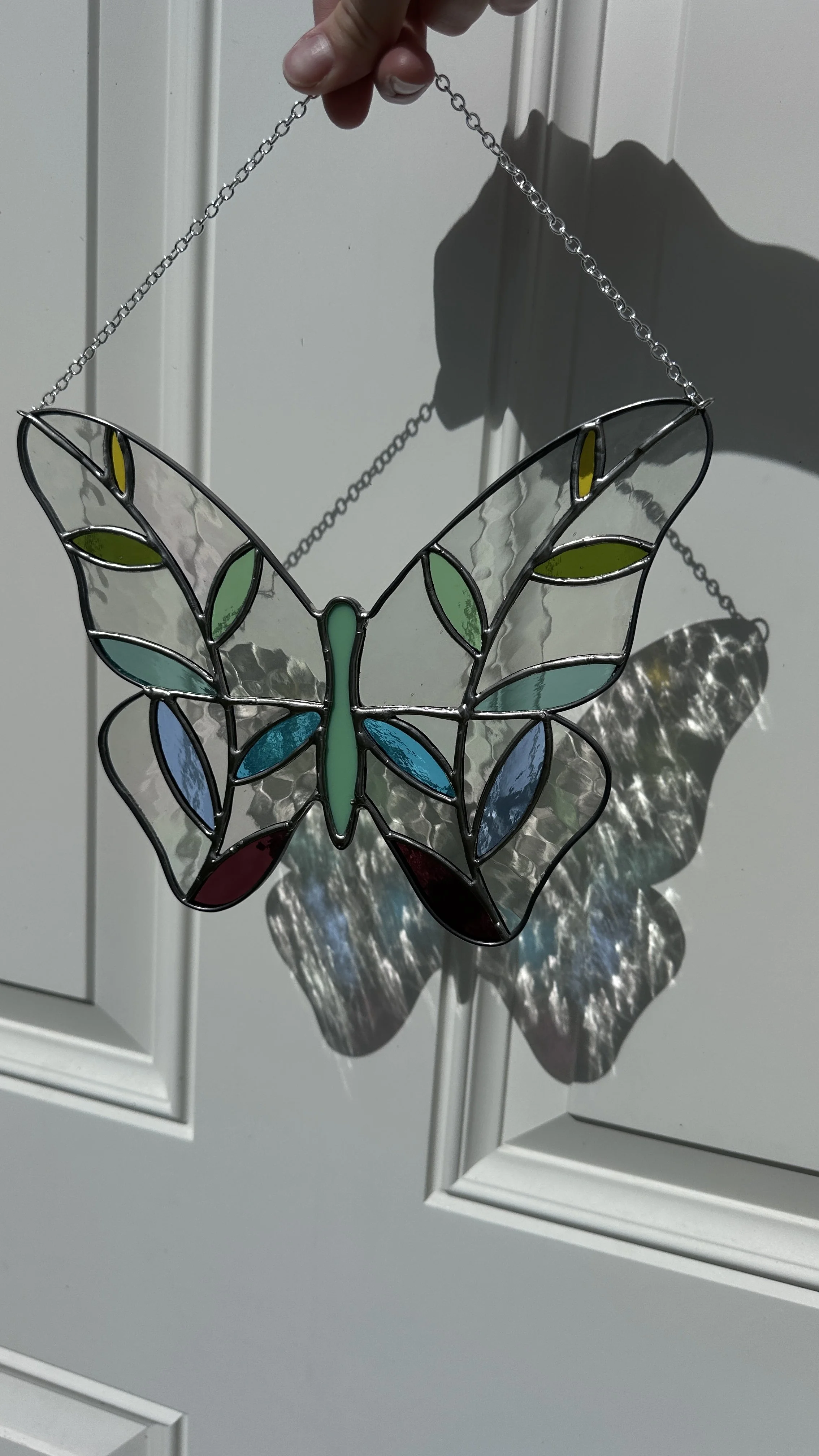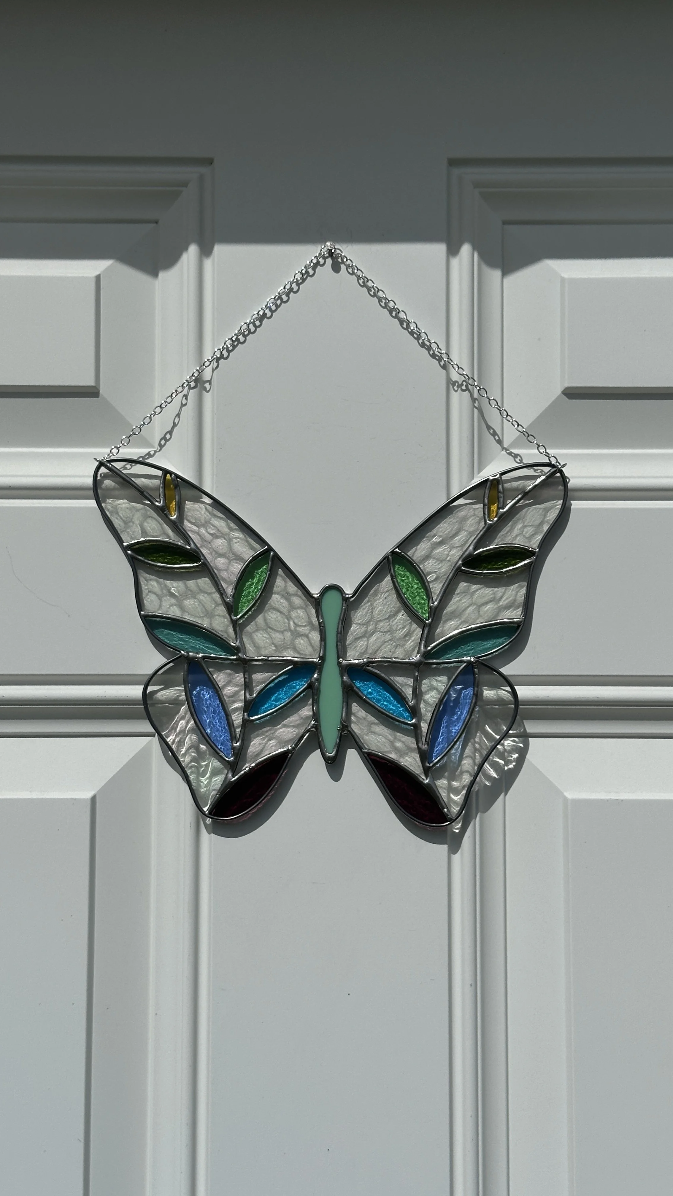 This charming stained glass sun catcher features a simple, cute fluffy black and white sheep, adding a touch of whimsy and warmth to any window.