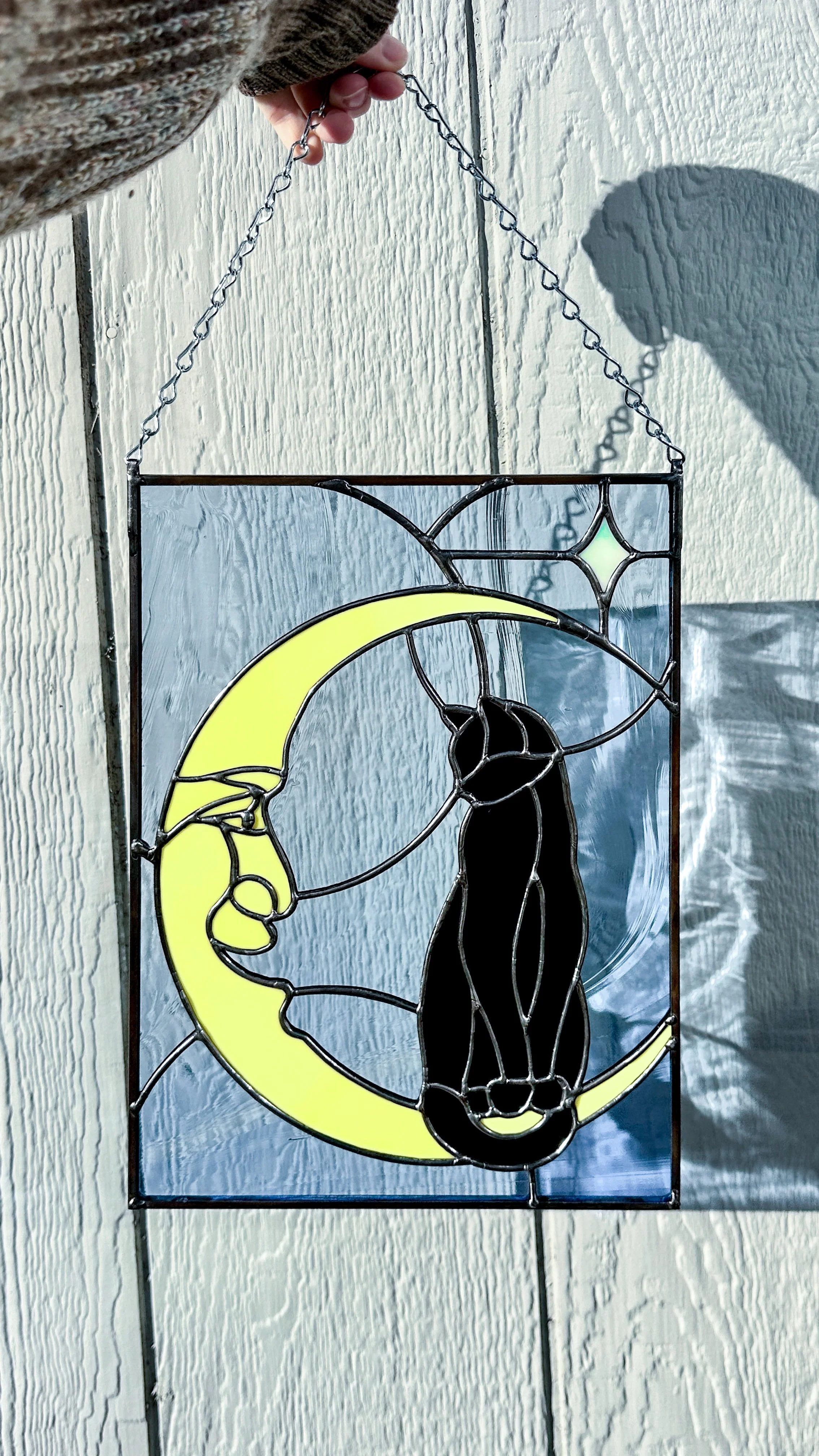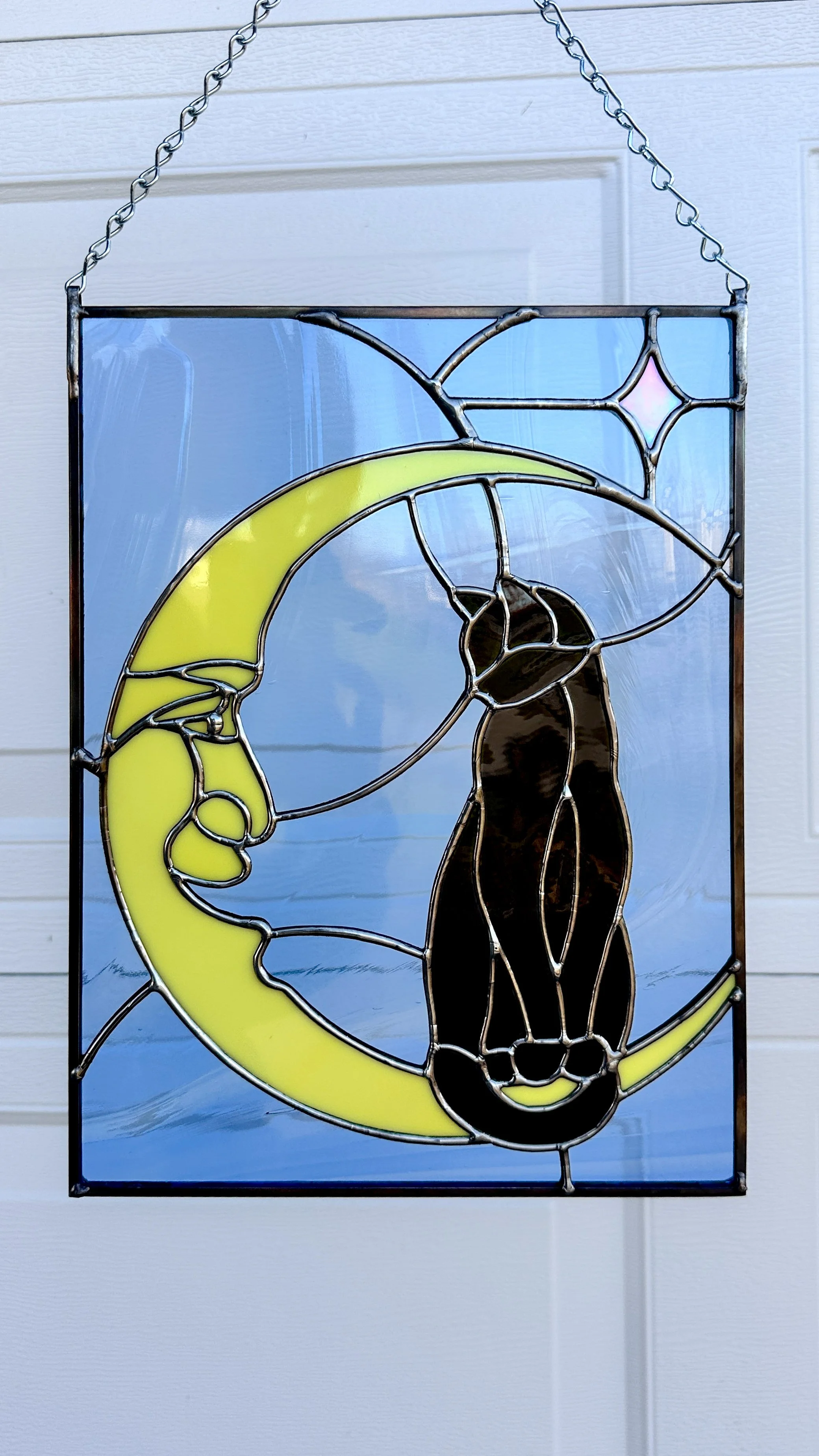 This stained glass sun catcher features a graceful orca against a textured background of two shades of blue glass, accented with bubbles to evoke the feeling of underwater serenity.