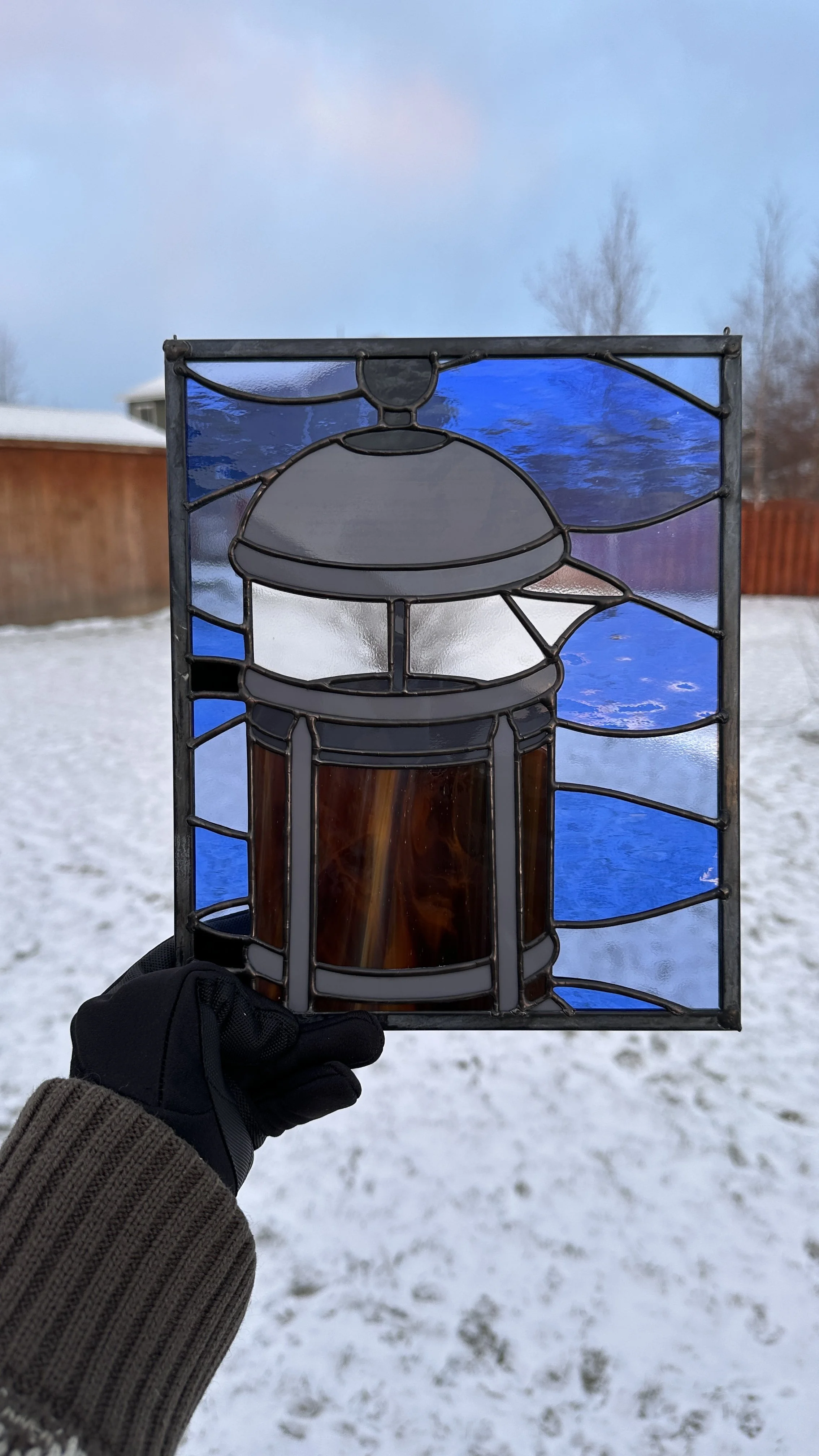 A traditional-style stained glass sun catcher featuring a vibrant orange flower design, perfectly crafted to brighten any window with colorful light.